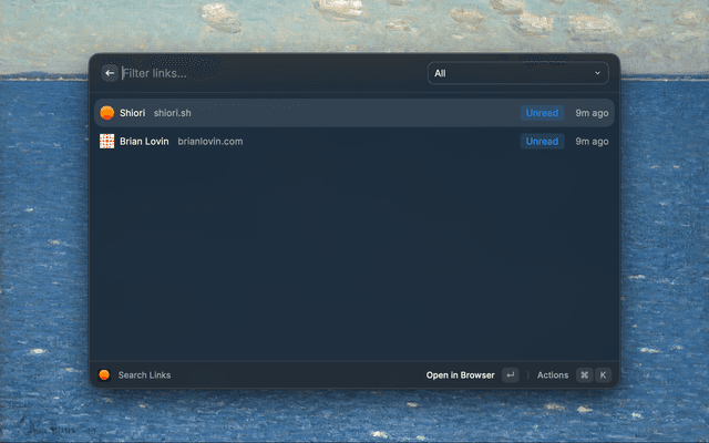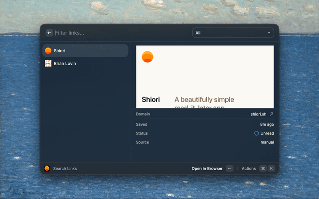 Search, save, and manage your Shiori bookmarks. Mark links as read, delete them, save from clipboard, and track unread count in the menu bar.
