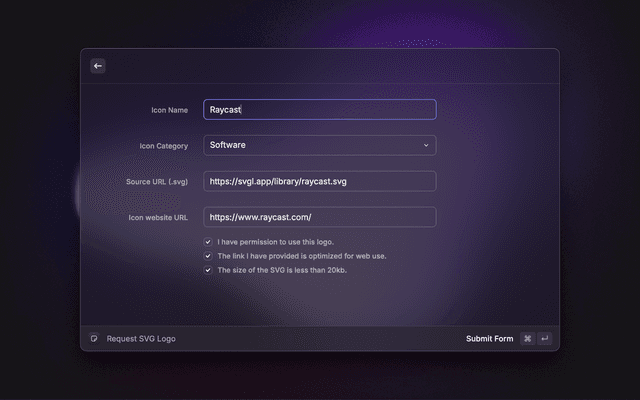 You can use the Request SVG Logo command, enter the required information in the form, and it will automatically redirect you to the svgl repository issue page, where the template will be pre-filled for you.