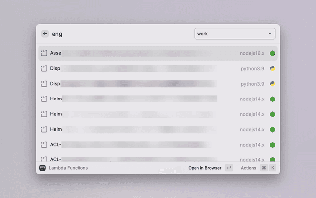 • Find and open resources (e.g. ECR Clusters, ECR Repositories, S3 Bucket, EC2 Instance, DynamoDB Table, CloudWatch Log Group, Parameter Store, Secrets Manager, Glue Jobs, Amplify Apps)