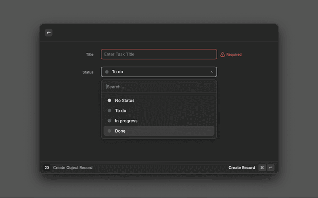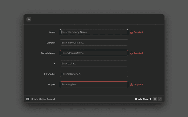 To create a record for any object, select your target object and press ENTER. This will open a form that matches the exact table schema you created in your CRM, following any validations it suggests to successfully create your record by pressing CMD + ENTER. Records cannot be created with an empty first column (such as Name, Title, etc.).