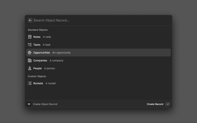 To use the extension, search for the Create Object Record command, which will display all your active standard and custom objects currently in your twentyCRM. Its very flexible - if you create new objects or deactivate existing ones, this will automatically reflect those changes.