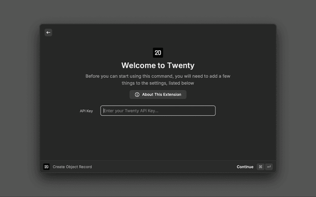 Get your API Keys from twenty developer settings , navigate to Raycast Command settings or try to access command which will open up view to provide your API key.