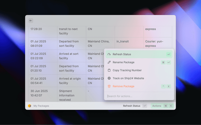 Unofficial Raycast extension for tracking packages and shipments using Ship24's comprehensive tracking service.