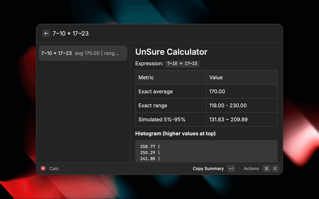 Lightweight probabilistic calculator that lets you type ranges (with ~) and arithmetic to see exact bounds plus simulated outcomes and a text histogram.