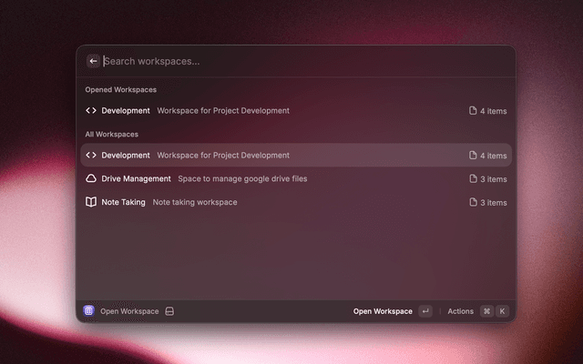 List and launch your workspaces. Simply search for a workspace and press Enter to open all its items.