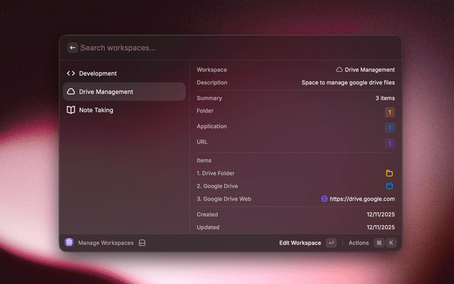 • ๐Ÿ“ฆ Workspace Bundles: Group apps, folders, files, URLs, and terminal commands together