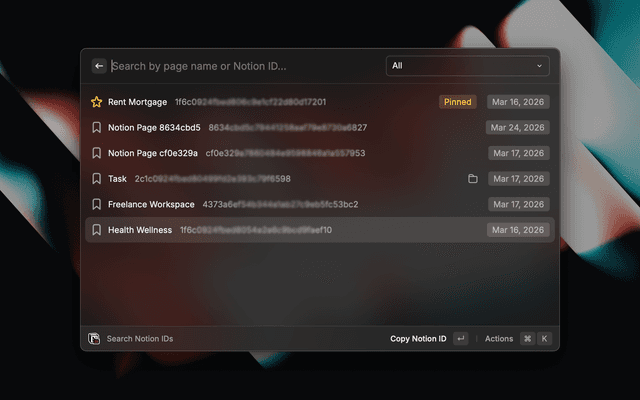 Extract, save, and organize Notion page and database IDs directly from Raycast. It is useful when you need raw Notion IDs for automations, API calls, formulas, embeds, filters, or internal tools without digging through links manually.