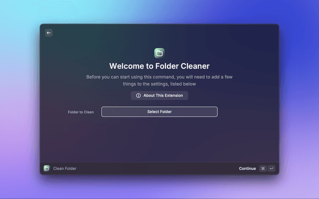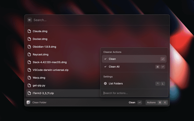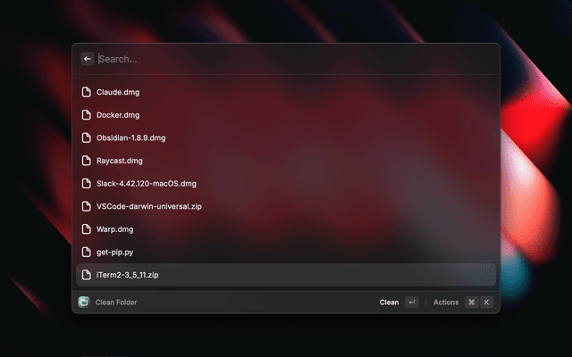 Folder Cleaner is a Raycast extension that allows users to automatically clean a specific folder. It can filter by file extension and move those files to their appropriate location.