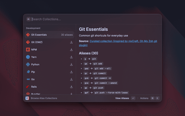 Cmd+N or click "Add New Alias"# Example: Add a quick git status alias