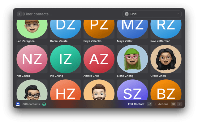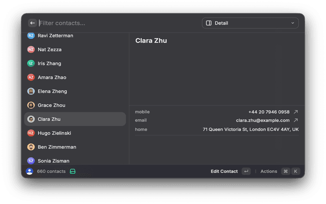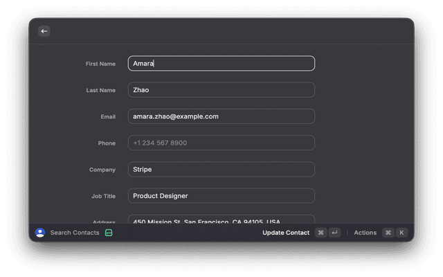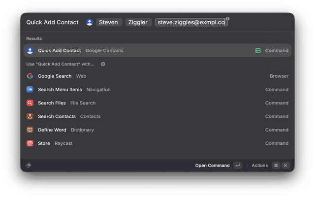 Add a contact directly from the Raycast command bar without opening a window. Tab through: