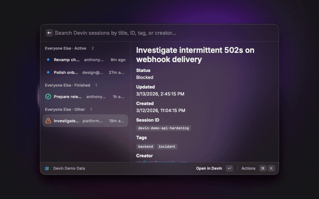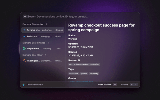 Devin for Raycast gives you a fast command palette for working with Devin sessions without leaving your keyboard.