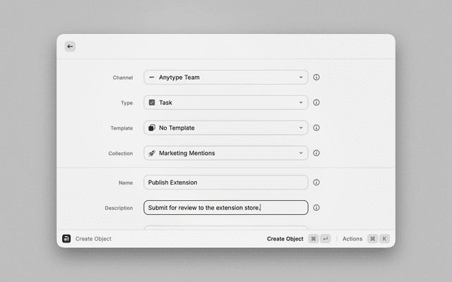 - Interact: Press Enter to view the object in Raycast or Command+Enter to open it in Anytype.