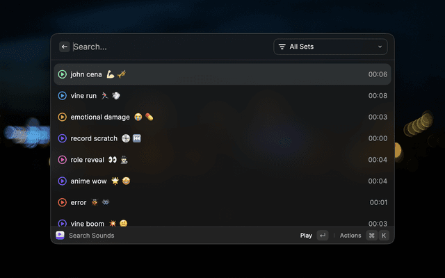 To be able to play a specific sound with a keyboard shortcut, execute the "Add Shortcut" action while focused on a sound in the "Search" command. This will add an Apple Shortcut which contains further instructions (they're few and simple).