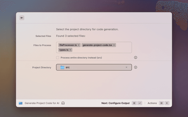 1. First, fire up the command. You can open Raycast and type "Generate Project Code for AI" (or your chosen command title).