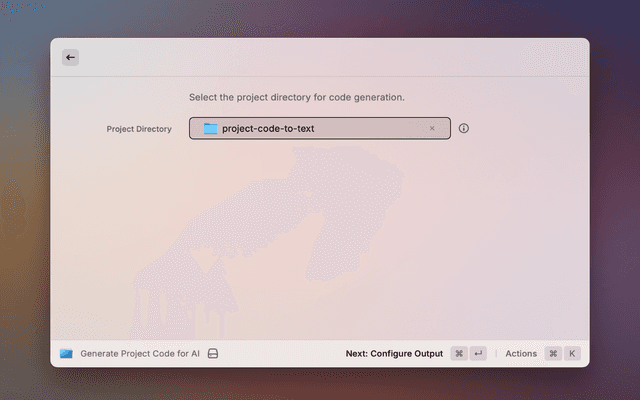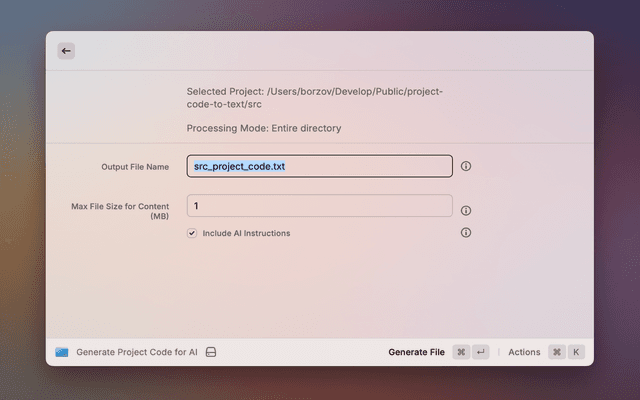 Ever needed to quickly grab all the code from a project, neatly packaged into one text file? This Raycast extension does just that! It's perfect for feeding your codebase to AI tools, creating an archive, or just having everything in one place for easy sharing and review.