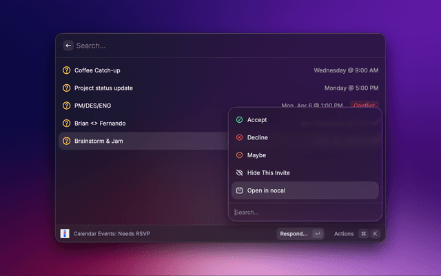 - Pending RSVPs — See calendar events awaiting your response. Accept, decline, or mark as maybe directly from Raycast.