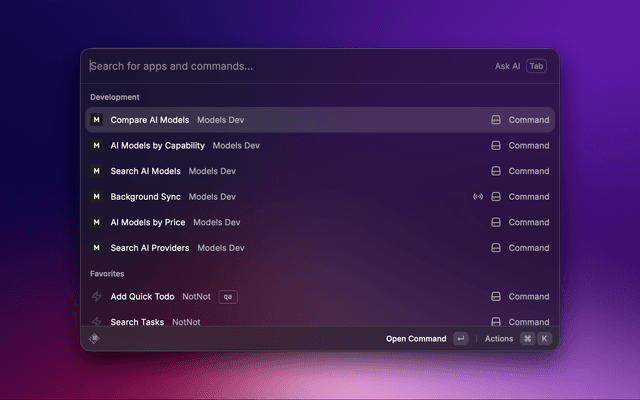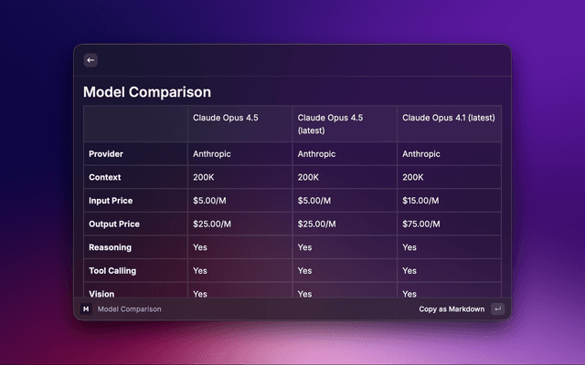 Select up to three models for side-by-side comparison. View pricing, context windows, and capabilities in a table. Export comparisons as markdown.