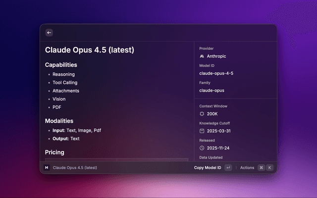 Browse AI model specifications, pricing, and capabilities from models.dev—a community-maintained database of AI models across providers.