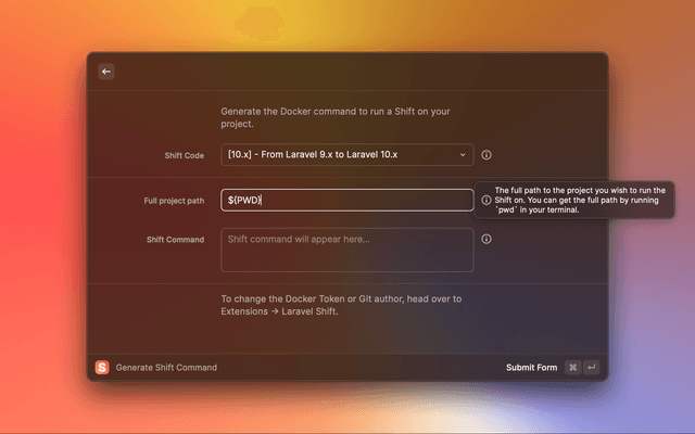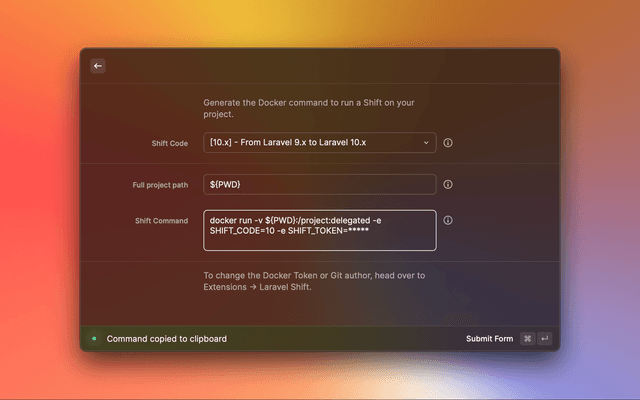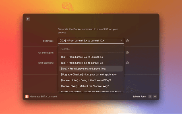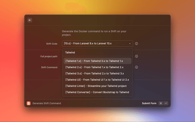 This Raycast extension allows you to generate any of the Docker Shifts for Laravel, Lumen, PHP, Django, and Tailwind. See te official Running Shift for Docker docs for installation and setup.