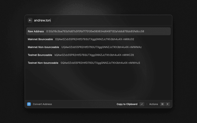 Convert TON blockchain addresses between different formats and resolve .ton domain names.
