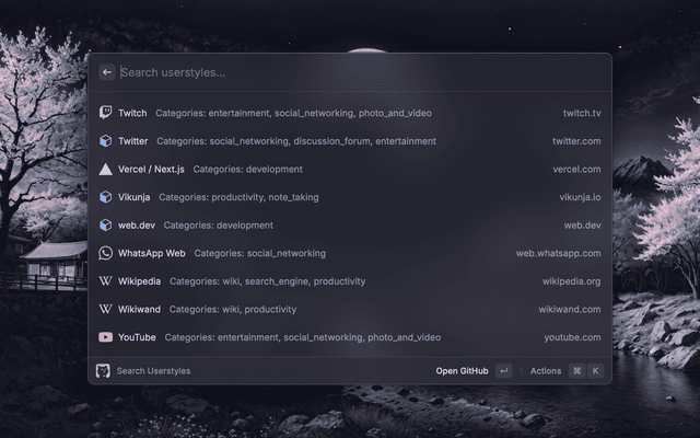 You can also apply Catppuccin's soothing pastel palette to websites using CSS userstyles. Userstyles are easy to apply via the Stylus browser extension. Make your browsing experience more delightful with Catppuccin's signature styles.