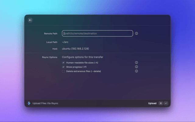- Open Raycast and search for "Upload Files via Rsync"