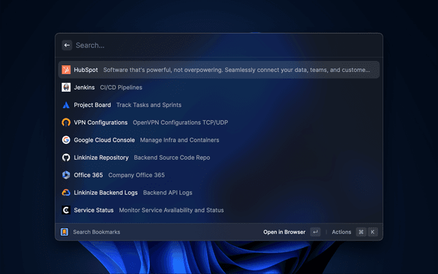 Linkinize Raycast extension makes it easy to access your bookmarks without leaving your screen.
