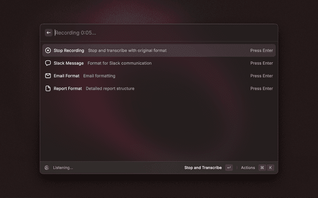 - Press Enter to stop and transcribe, or select a specific format (Email, Slack, Report)