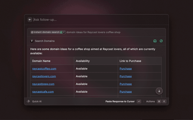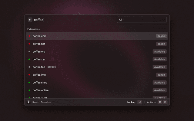 The fastest domain name search tool on the internet, now available as a Raycast extension. Search for available domain names instantly with real-time results powered by instantdomainsearch.com.