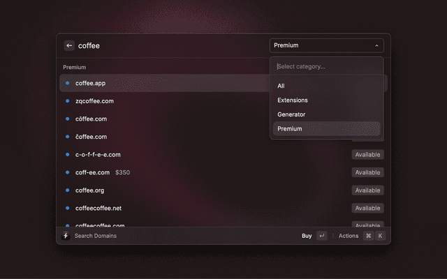 Find domains, check availability, search popular extensions, and buy premium domains.