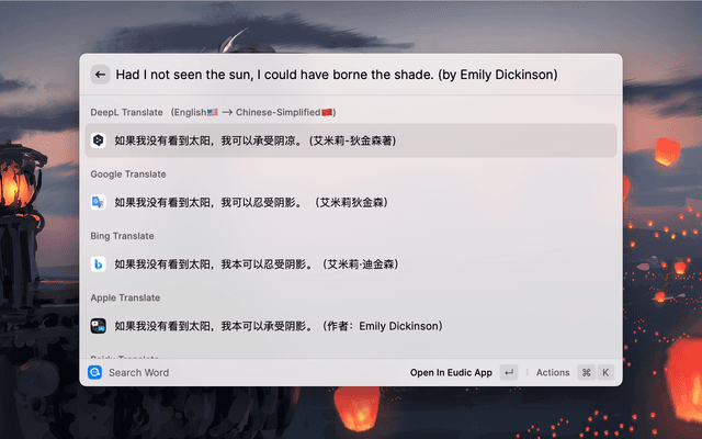 Currently, we support DeepL, Google, Bing, ๐ŸŽ Apple, Baidu, Tencent, Volcano, Youdao and Caiyun translation, total 9 translation services.
