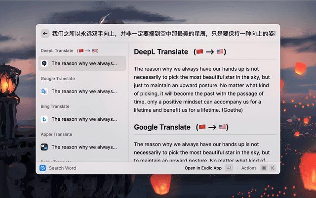 Easily look up words or translate text, support 48+ languages, support Linguee and Youdao dictionary, support OpenAI, DeepL, Google, Bing, Apple, Baidu, Tencent, Volcano, Youdao and Caiyun translation.