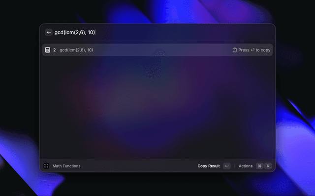 Evaluate mathematical expressions with real-time results. Supports common functions like sum, gcd, lcm, trigonometry, and more. Type expressions and press Enter to copy results.