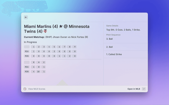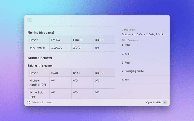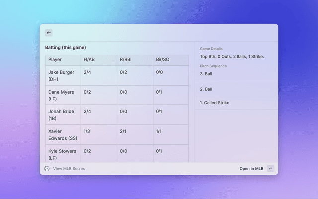Browse up-to-date MLB standings grouped by league and division. See wins, losses, win percentage, and games back. You can choose which league (AL or NL) appears first via a command argument or preference.