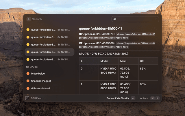 Monitor GPU and CPU usage across your SSH hosts directly from Raycast. See which machines are free, busy, or offline at a glance, then connect in one keystroke via your preferred terminal or editor.