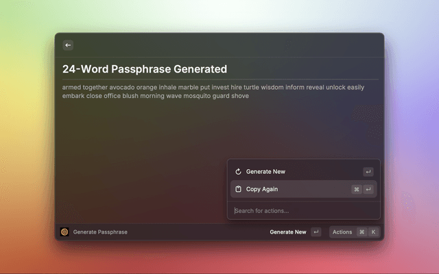 Generate Password CommandGenerate Password (Quick) CommandGenerate Passphrase CommandCommander Service Mode needs to be running in order for the Raycast extension to communicate with Keeper. If the Terminal app closes, you can easily start Commander Service Mode using this one-line command from your terminal: