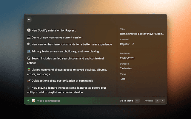 Summarize any YouTube Video with AI. Choose between Raycast, OpenAI or Anthropic. You have to either be a Raycast Pro Member or have an OpenAI/Anthropic API Key.