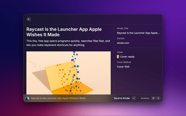 Writes the EPUB and opens it with the Amazon Send to Kindle app. If Raycast cannot open the app directly, it tries to find a compatible app by name.
