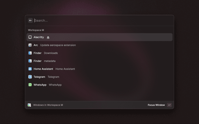 • Use the Aerospace Switch Apps command to show the app in current workspace