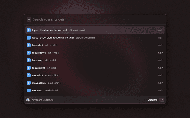 • Use the Aerospace Shortcuts command to view all shortcuts parsed from your config file
