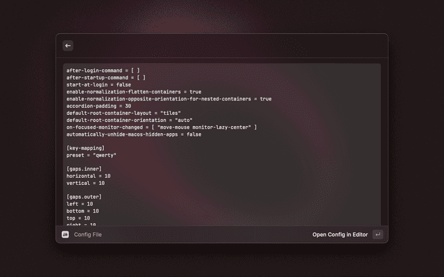 • View all shortcuts parsed from your config file (loads the config path using aerospace config --config-path)