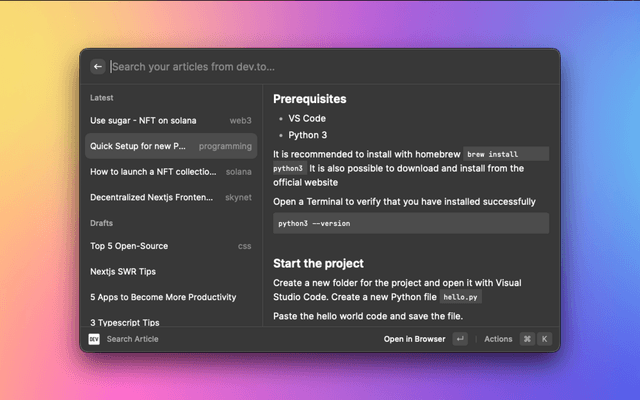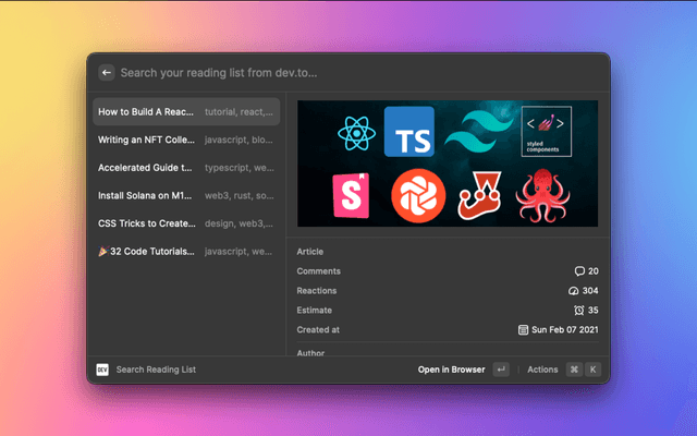 Open reading list, create article, and manage articles on DEV Community with Raycast.