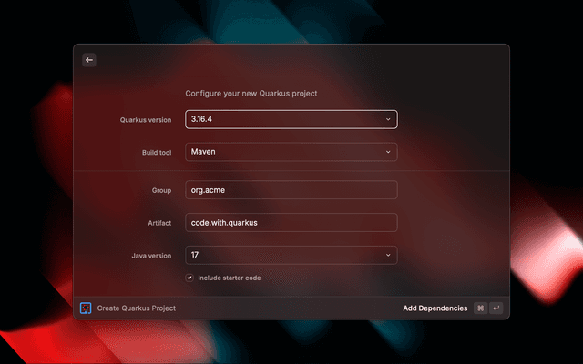 Fill in your project configuration (Quarkus version, build tool, groupId, artifact name, java version)