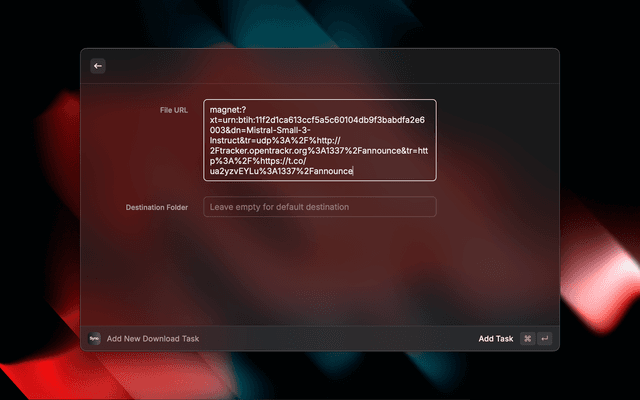 - Support for HTTP/HTTPS URLs, FTP URLs, and magnet links