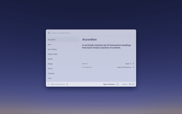 Browse shadcn/ui documentation, components and examples