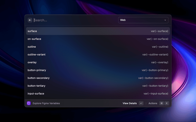 This Raycast extension allows users to interact with their Figma designs by fetching and displaying variable collections from a Figma file. Users can view details of each variable within a collection, including mode-specific values and code syntax.