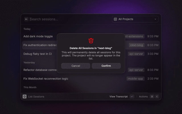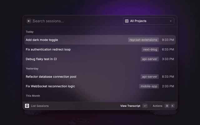 View full transcripts, generate summaries, and manage session data directly from Raycast.
