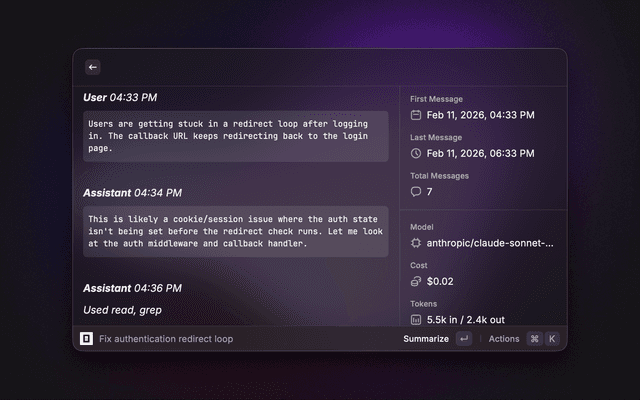• Copy transcripts, session IDs, slugs, and resume commands
