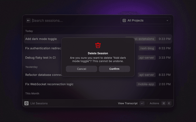 • Browse all sessions with time-grouped sections (Today, Yesterday, This Week, etc.)