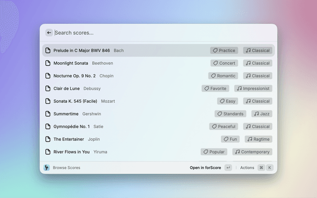 Note: Re-export the CSV from forScore whenever you add new scores. Raycast will automatically pick up the changes if you save to the same file path.